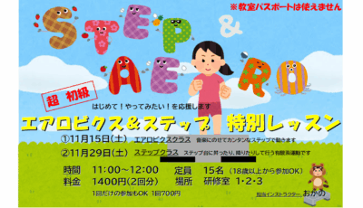 開催日 ①11月15日(土)エアロビクスクラス (音楽にのせてカンタンなステップで動きます)